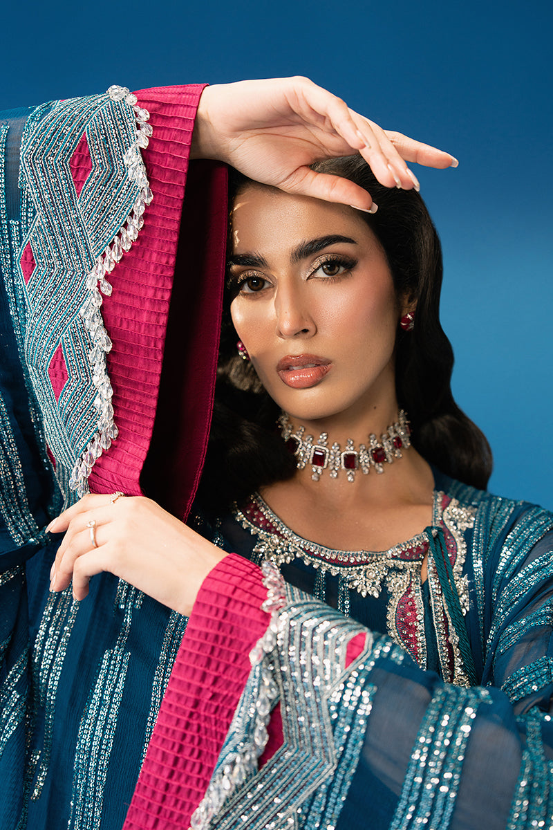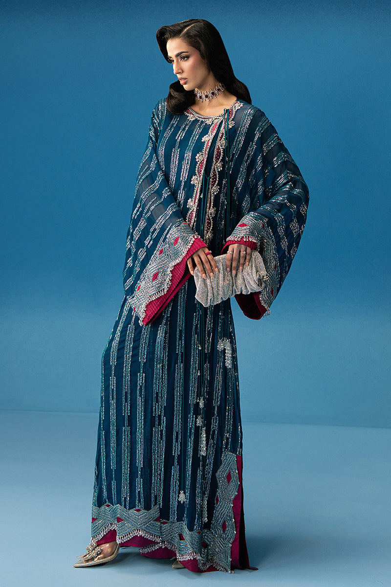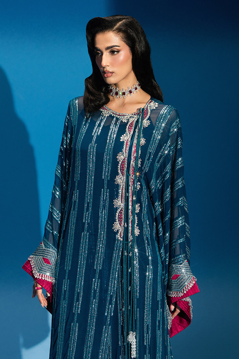 Astre evokes the mystery of a night sky in deep TEAL. Sequins shimmer across diaphanous chiffon, cascading like stardust, while crystal tassels sway with each movement. The boxy sleeves, touched with a rose-tinted accent, frame the look with contemporary grace, creating a luminous, unforgettable presence.