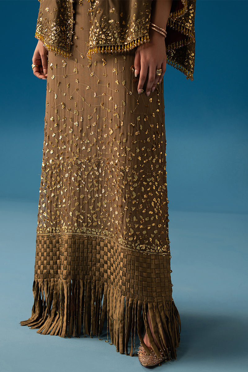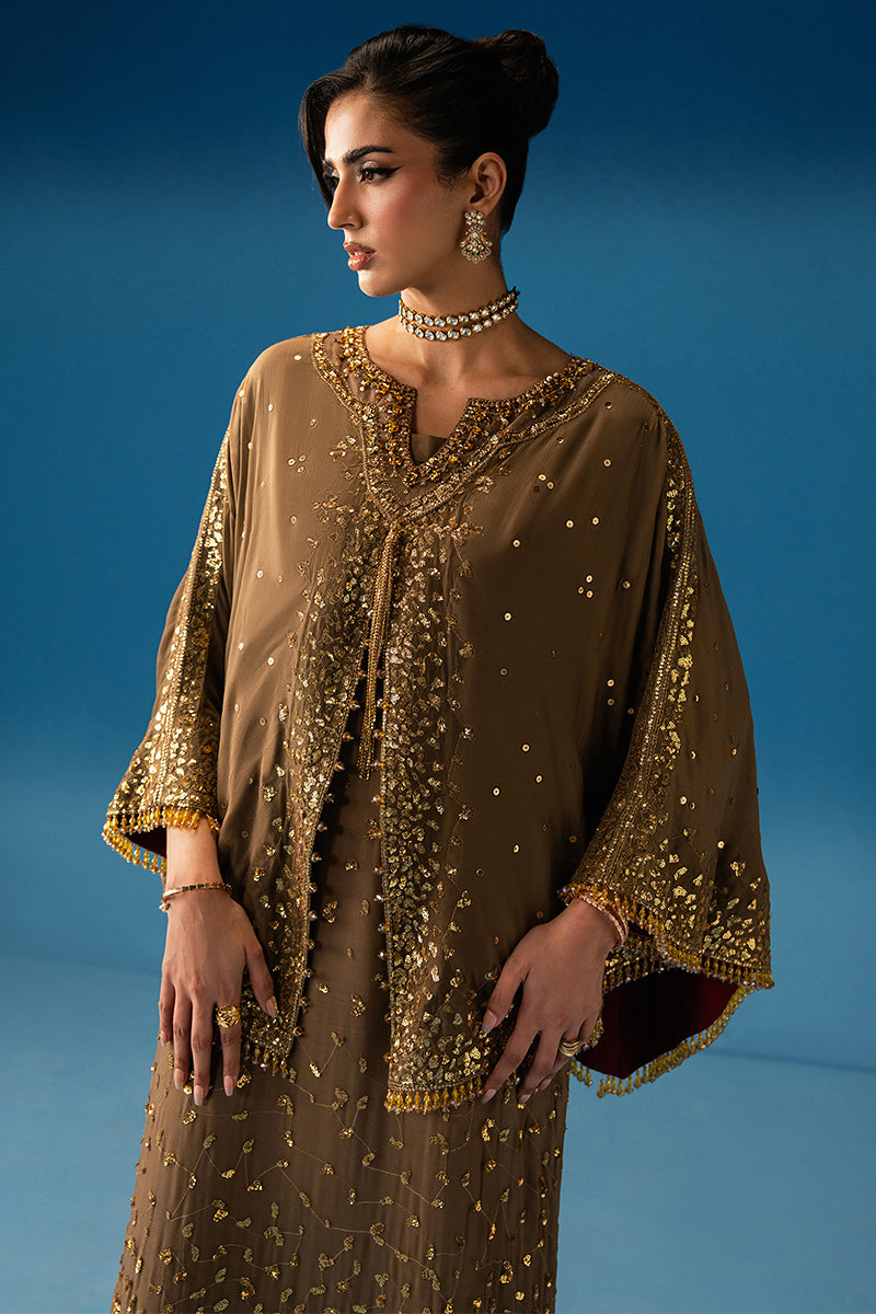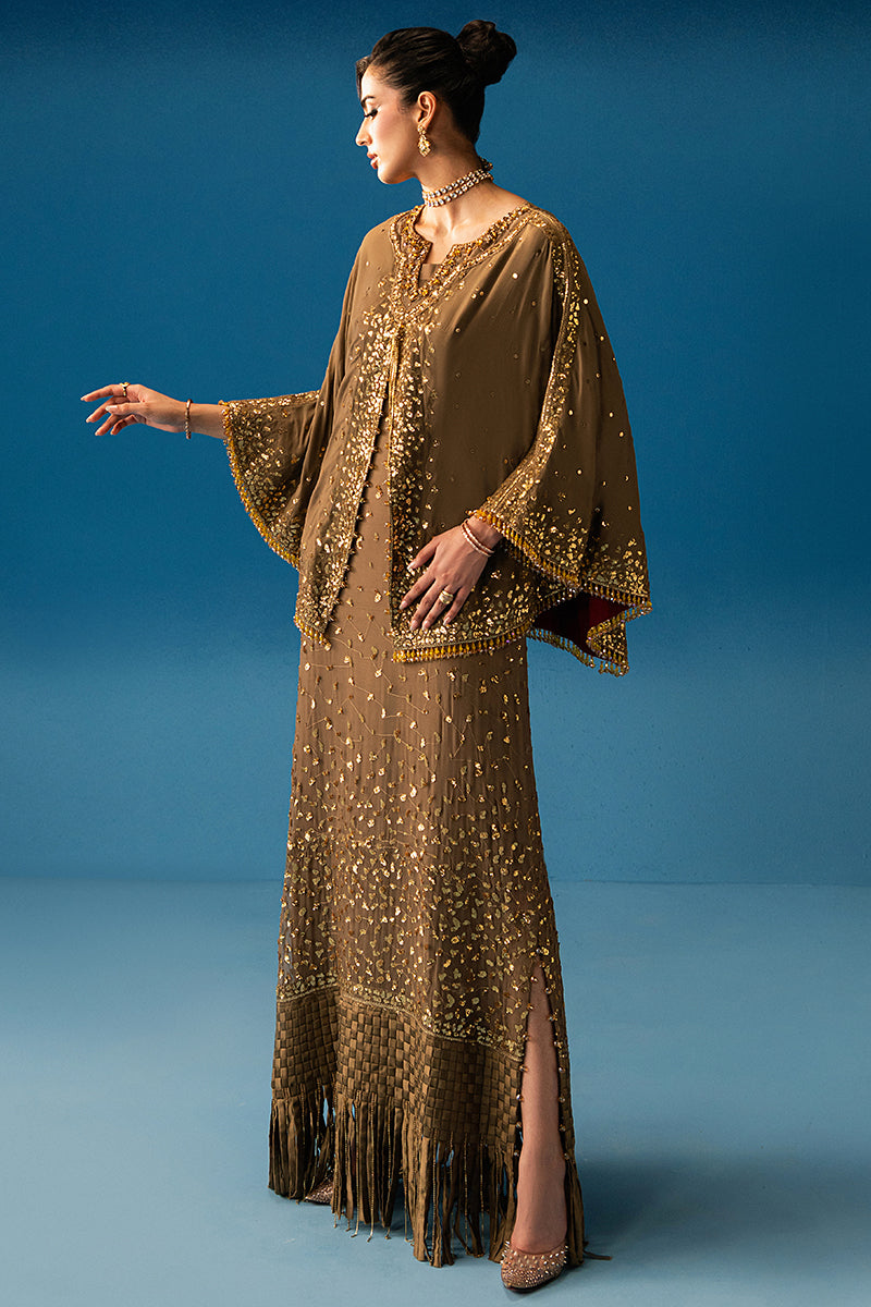 Aurore reflects the soft glow of dawn in warm MOCCA hues. Its fluid silhouette, paired with a woven-border underdress, flows with subtle grace. Embellished neckline and crystal danglings add light-catching accents, evoking the quiet glamour of a new beginning.