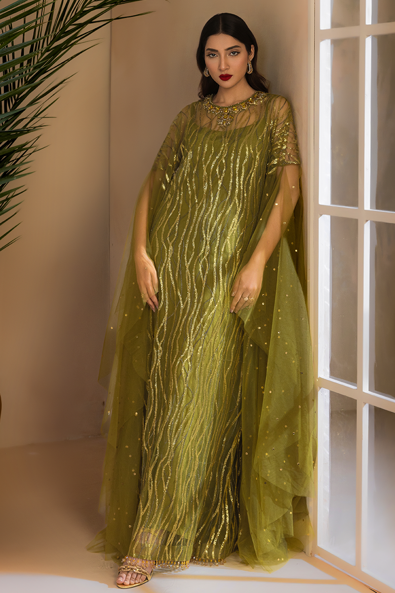 “Olivier” is the embodiment of quiet opulence. In rich olive tones, the elongated silhouette is refined with a crew neckline intricately embroidered by hand. The statement sleeves, adorned with elaborate detailing, sway with a dignified rhythm, an ode to timeless elegance sculpted in thread and shimmer.